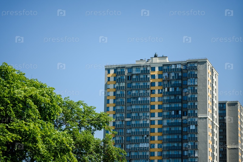 Высотное здание на фоне голубого неба и зеленых деревьев. Россия, Санкт-Петербург, 23 июня 2020 г.:
