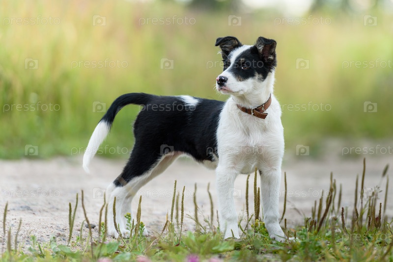 Счастливый щенок в траве в солнечный летний день