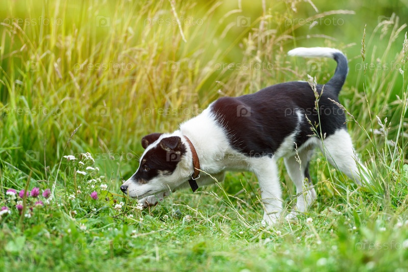 Счастливый щенок в траве в солнечный летний день