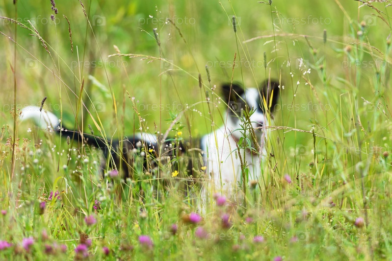 Щенок на прогулке в траве - размытый фон