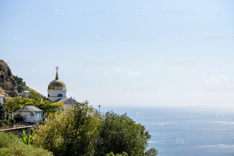 Крым, Балаклава, 15 сентября 2019 г.: монастырь Святого Георгия и пляж Яшма, вид сверху
