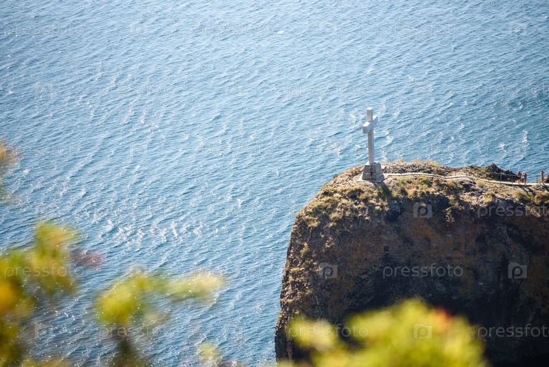 Крым, Балаклава, 15 сентября 2019 г.: вид сверху на Черное море. Морской пейзаж летом