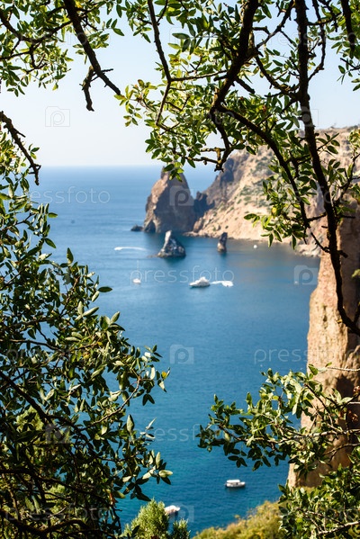 Крым, Балаклава, 15 сентября 2019 г.: вид сверху на Черное море. Морской пейзаж летом