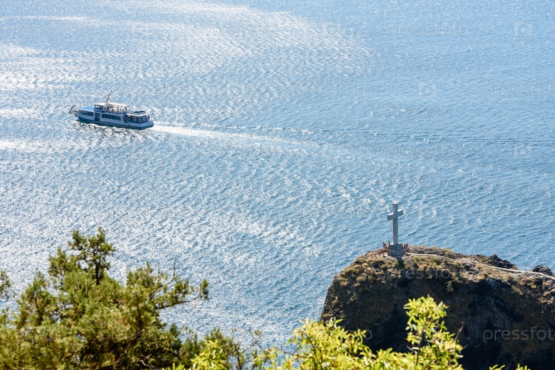 Крым, Балаклава, 15 сентября 2019 г.: вид сверху на Черное море. Морской пейзаж летом