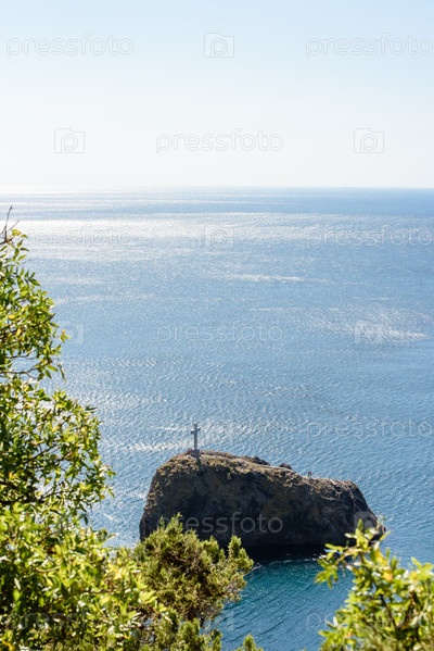 Крым, Балаклава, 15 сентября 2019 г.: вид сверху на Черное море. Морской пейзаж летом