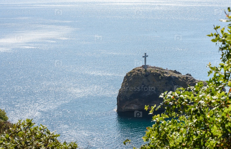 Крым, Балаклава, 15 сентября 2019 г.: вид сверху на Черное море. Морской пейзаж летом