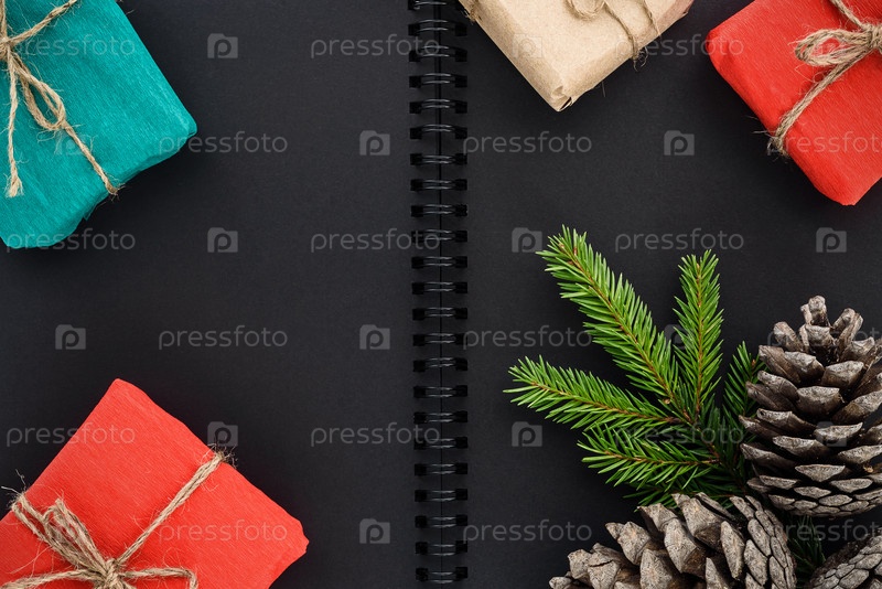 Рождественские и новогодние подарки на фоне блокнота