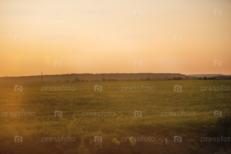Поле на закате с золотой травой, солнечное