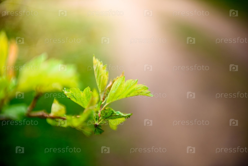 Зеленые листья на ветке крупным планом. Красивый летний фон. Солнечный свет
