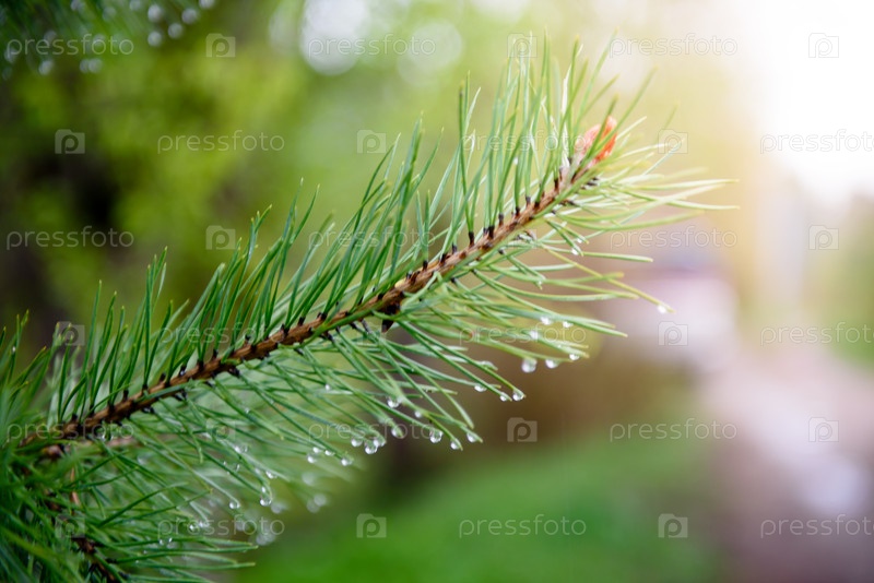 Капли дождя на еловой ветке крупным планом. Дождливая погода