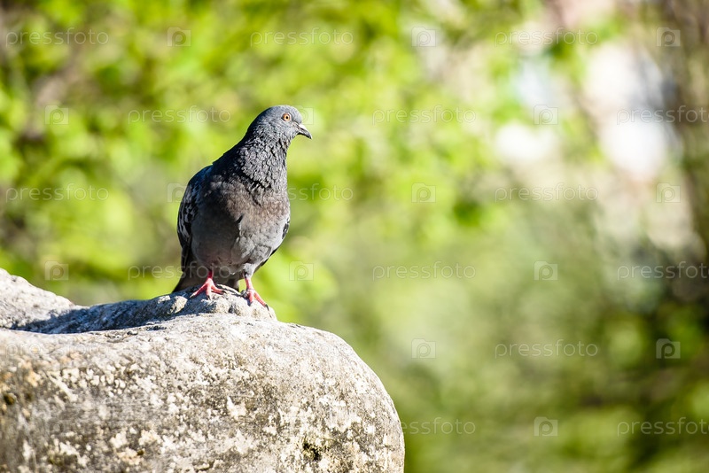 Летом голубь сидит на камне в городском парке