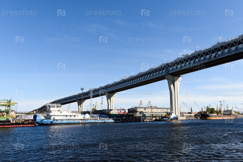 Россия, Санкт-Петербург, 30 мая 2020 г.: Главный автодорожный мост через морской порт. Корабли и краны