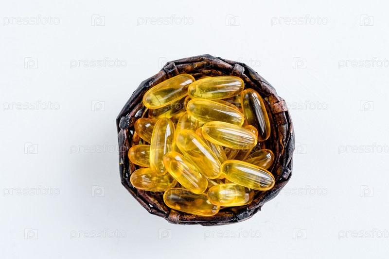 Капсулы Омега-3 золотого рыбьего жира крупным планом на белом фоне