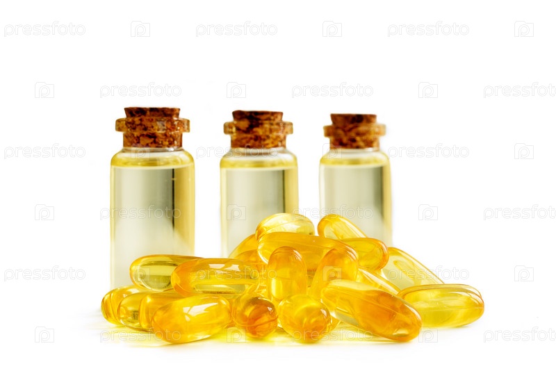 Капсулы Омега-3 и стеклянные банки с золотым рыбьим жиром крупным планом на белом фоне