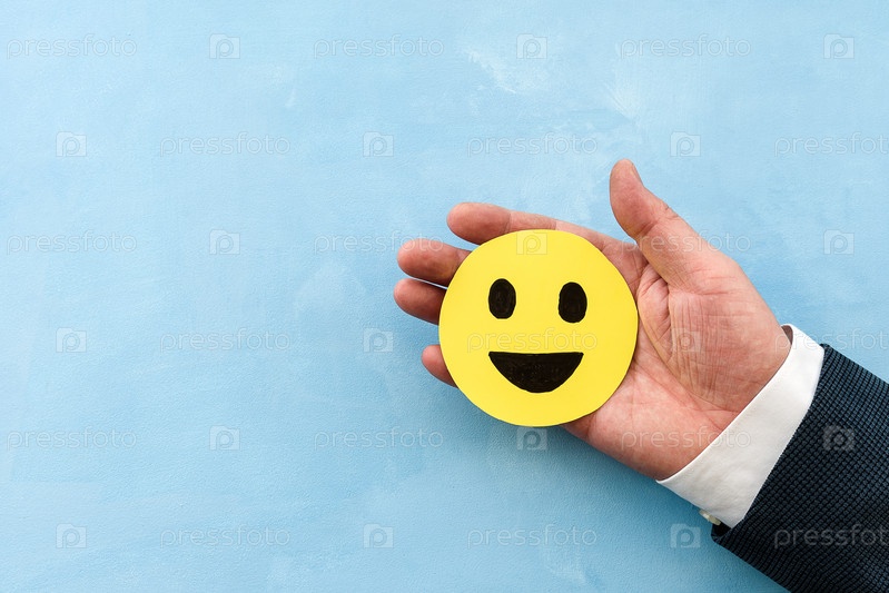 Рука мужчины в деловом костюме держит желтый смайлик со значком счастливого лица на синем фоне
