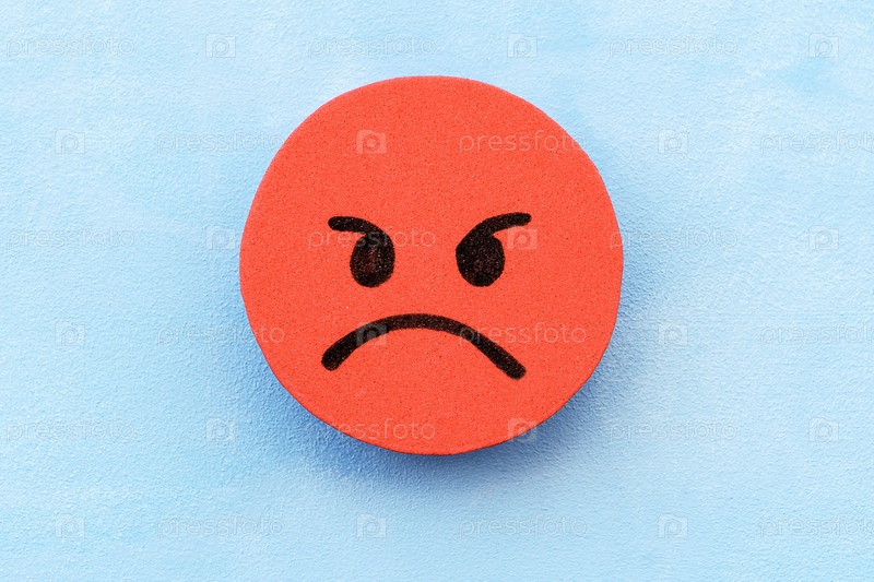 Красное сердитое лицо на синем фоне. Понятие негативного настроения. Недовольство клиентов