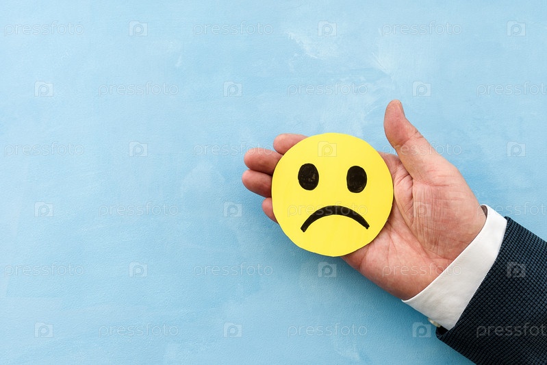 Рука мужчины в деловом костюме держит желтое лицо со значком недовольного лица на синем фоне. Понятие неудовлетворенности клиентов или отрицательных отзывов