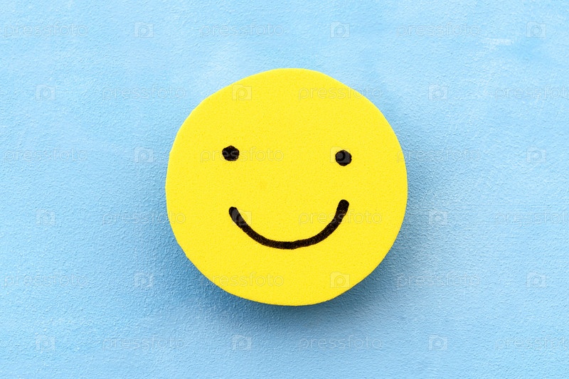 Желтый смайлик на синем фоне. Понятие позитивного настроения. Эмоции и обратная связь