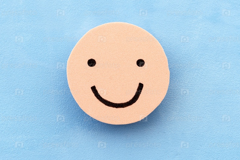 Желтое лицо на синем фоне. Понятие позитивного настроения. Эмоции и обратная связь