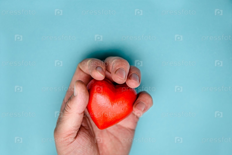 Красное сердце сжимается мужской рукой. Вид сверху на синем фоне