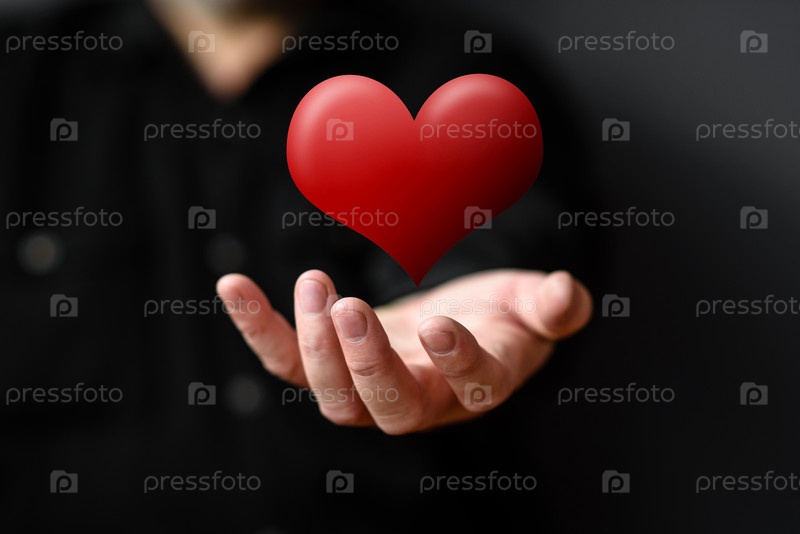 Мужская рука держит красное сердце на темном фоне. Понятие любви, здоровья и счастья