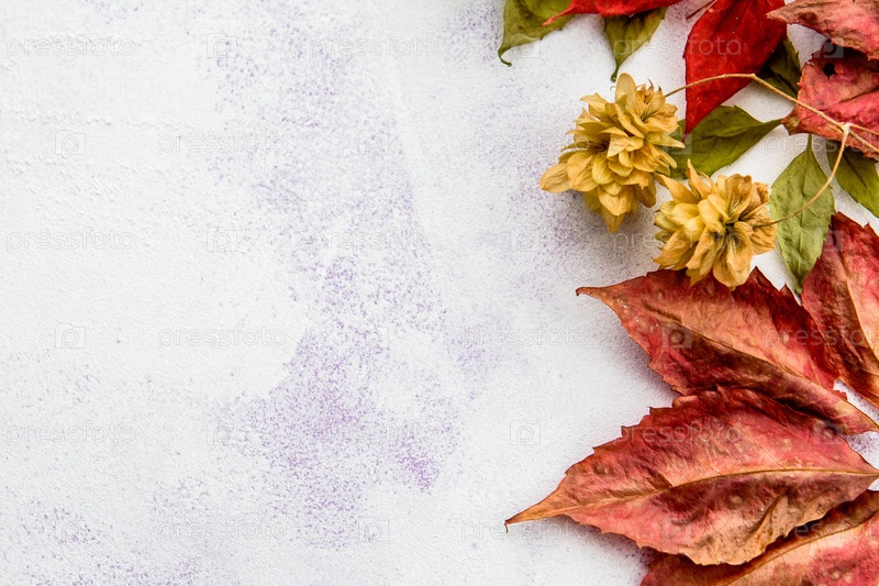 Красные осенние листья на светлом фоне — вид сверху. Рамка и пространство для копирования