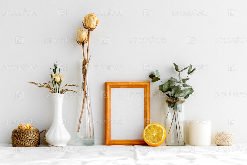 Деревянная фоторамка и сушеные растения в вазах на белом фоне. Минималистичная, нежная летняя планировка. Заготовка для открытки. Интерьер для дизайна