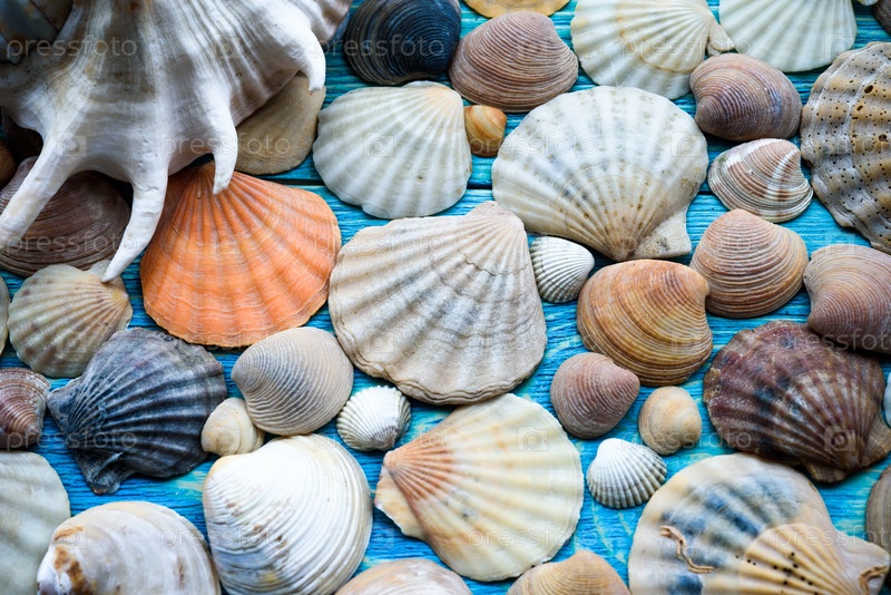 Фон морских ракушек на деревянном синем столе