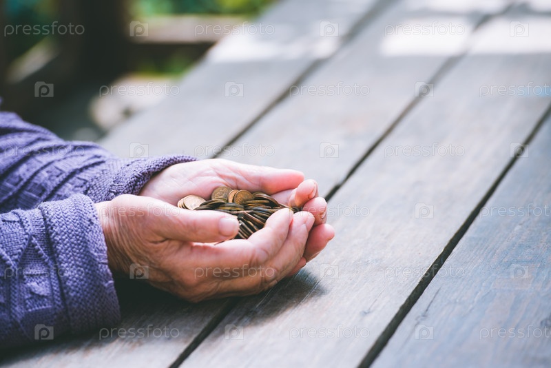 Деньги, монеты, бабушка на пенсии и концепция жизни, минимум - руки старухи, держащей горсть монет на деревянном столе