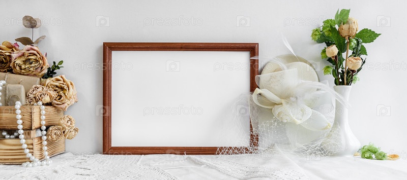 Модный белый фон с пустой фоторамкой и цветами. Заготовка для открытки. Женский свадебный фон