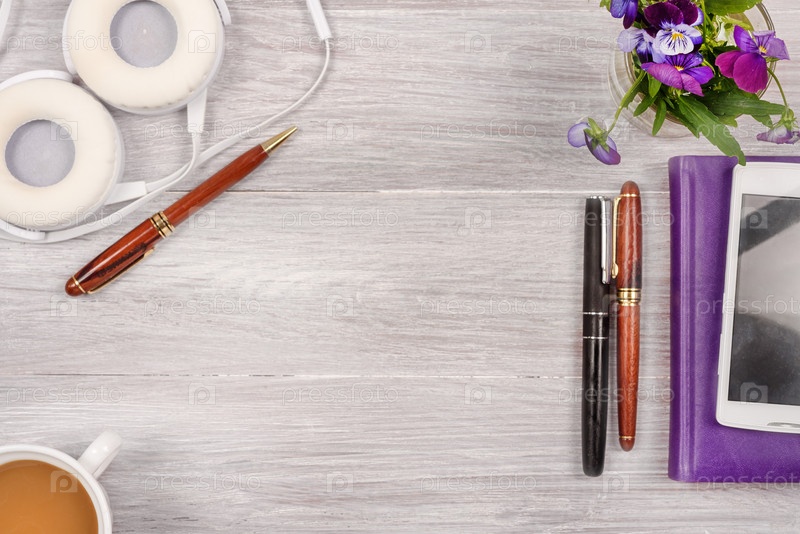 Вид сверху стола с наушниками, чашкой кофе и смартфоном