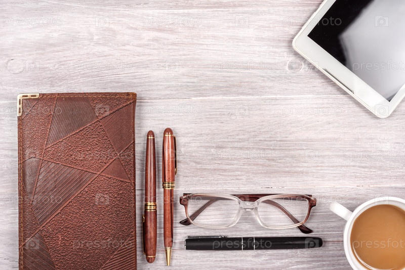Вид сверху стола с чашкой кофе, смартфоном, очками и блокнотом