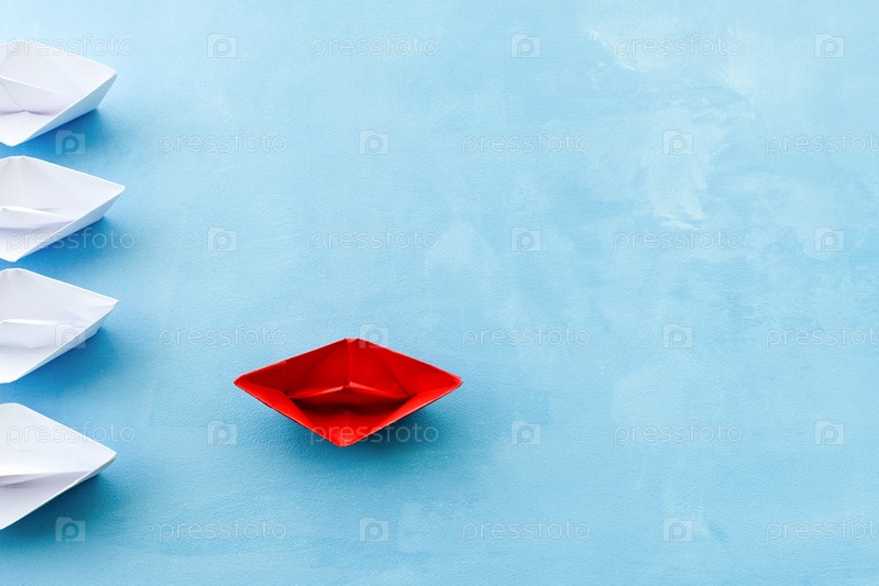 Концепция лидерства. Красный флагманский бумажный корабль на синем фоне ведет остальных вперед