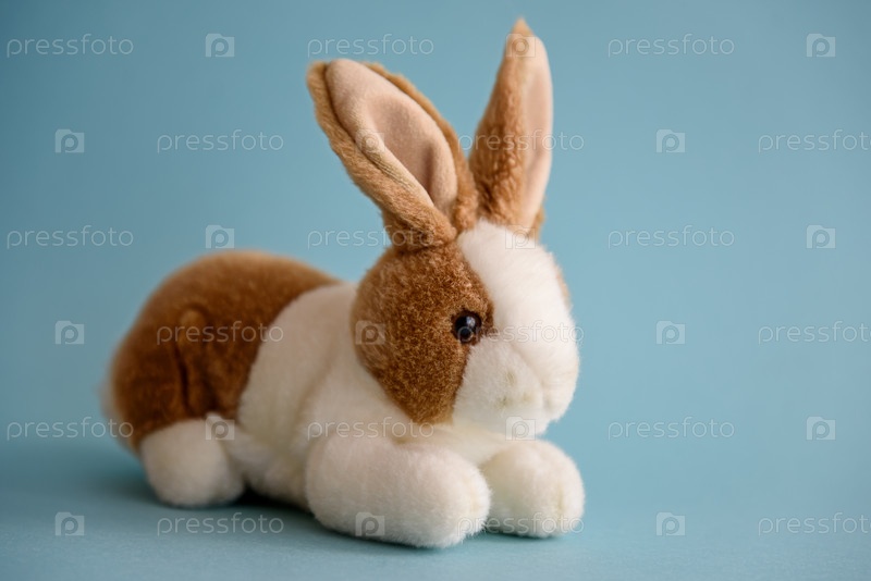 Мягкий игрушечный кролик на синем фоне