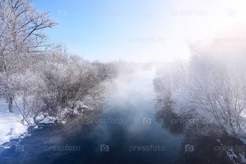 Зимний пейзаж в морозный день. Туман над рекой. Мороз и Солнце
