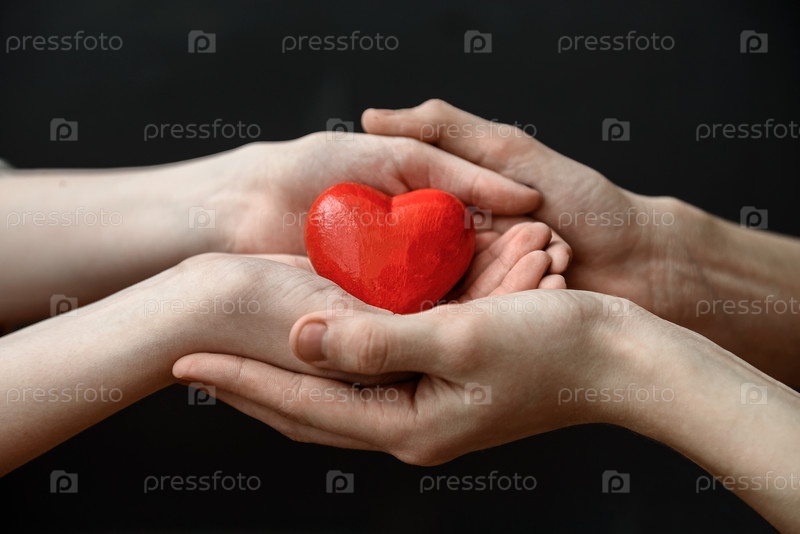 Красное сердце в руках молодого парня и молодой девушки на темном фоне
