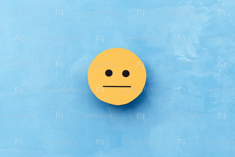 Желтое сдержанное лицо на синем фоне. Концепция выбора настроения и обратной связи с клиентами. Копирование пространства, бизнеса и эмоций. Душевное здоровье