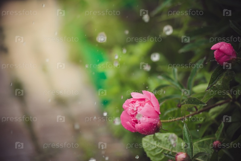 Красный пион под дождем. Капли дождя