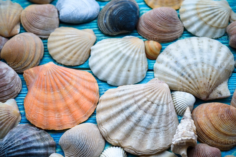 Фон морских ракушек на деревянном синем столе
