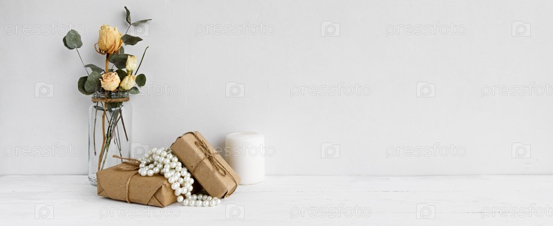 Модный фон запаса - цветы в вазе и декоративные поздравительные коробки на белом фоне. Женская свадьба или поздравление с копией пространства