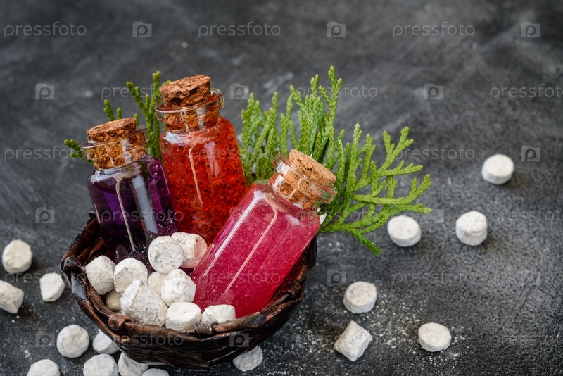 Гель для душа в стеклянных бутылках и соль для ванн на темном фоне. Спа-продукты и уход за телом