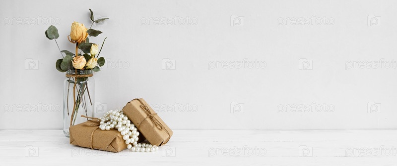 Модный фон запаса - цветы в вазе и декоративные поздравительные коробки на белом фоне. Женская свадьба или поздравление с копией пространства