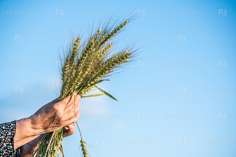 Колосья пшеницы, руки и концепция урожая - охапка колосьев зерна в руках на фоне неба