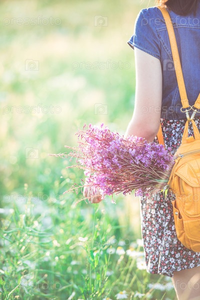 Крупный план фрагмента девушки в цветущем поле на закате. Летняя история на природе