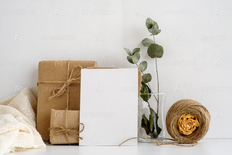 Фон канцелярских товаров моды на белом фоне. пустая открытка для надписей и подарков в крафт-бумаге. Свадебный фон. Пригласительная открытка