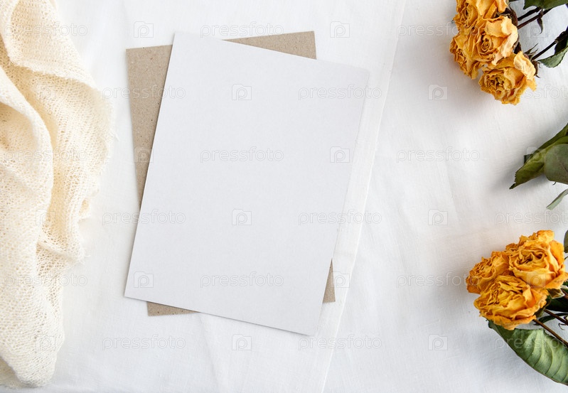 Модный фон канцелярских товаров - белая карточка для письма и веточки сухих растений на белом столе. Свадебный женский фон