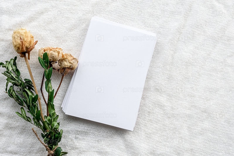 Модный женский фон на белом столе - цветы и заготовка для открытки. Свадебный женский фон