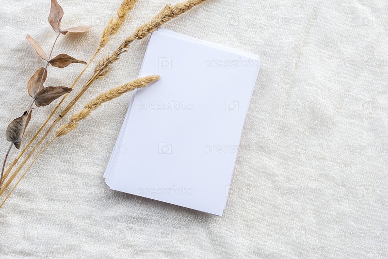 Модный женский фон на белой ткани - сухие цветы и пустая открытка. Свадебный женский фон. Заготовка для открытки