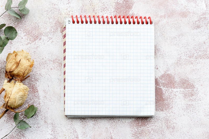 Канцелярские принадлежности романтический нежный фон-чистый блокнот, веточка эвкалипта и желтые розы. Вид сверху, крупный план и пространство для копирования
