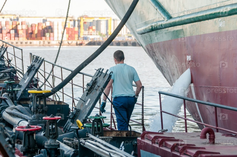 Россия, Санкт-Петербург, май 2021 г.: Сброс балластной воды на палубе нефтяного танкера в бухте порта